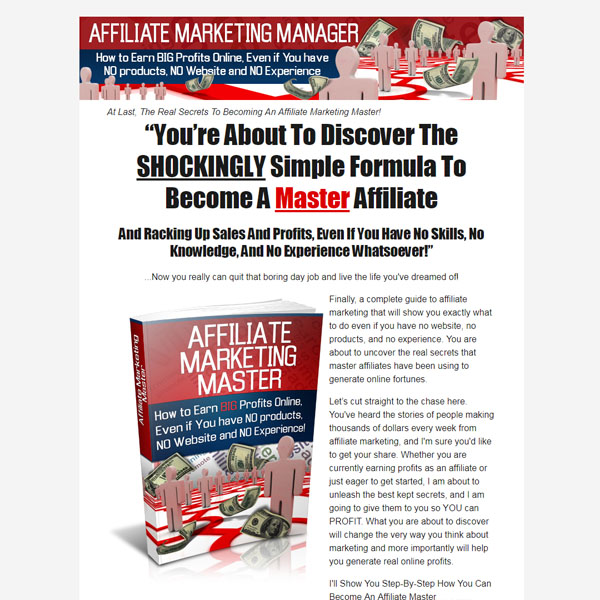 Finally, a complete guide to affiliate marketing that will show you exactly what to do even if you have no website, no products, and no experience. You are about to uncover the real secrets that master affiliates have been using to generate online fortunes.