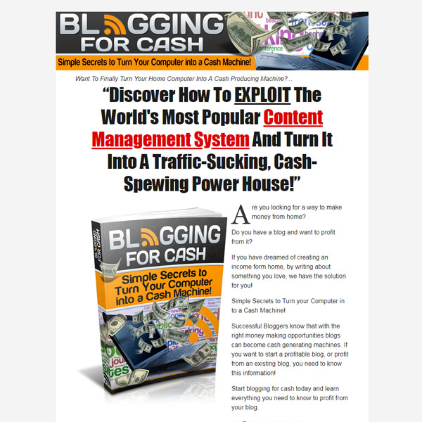 If you want to make money form your blog, this is the information you need. The Blogging for Cash e-book will set you up to profit and explain exactly how to make the most of your blog. Every money making option available to you is explained and outlined so you can make an informed decision.