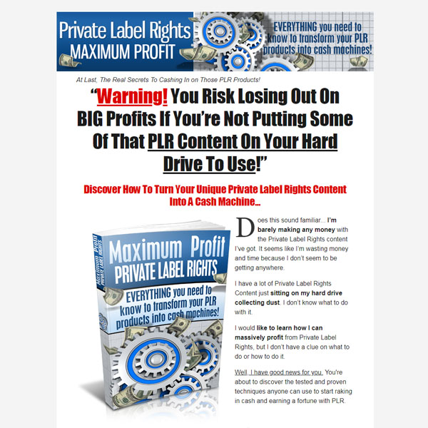 As you can see, through Maximum Profit Private Label Rights!, you’ll learn quite a few things about how to explode YOUR sales and profits using Private Label Rights products...