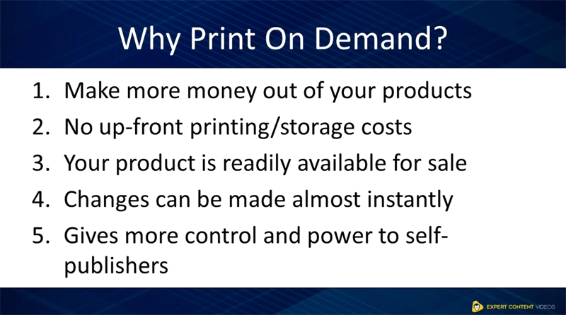 - What are the 5 key benefits that 'Print on Demand' offers (???and you shave off hours of hard work.)