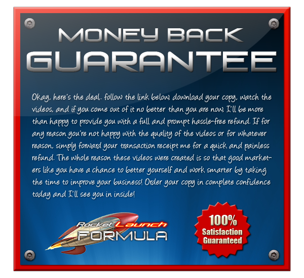 So order your copy of 'Rocket Launch Formula' today in complete confidence! But just before you do, please rest assured that you are backed by a completely risk-free guarantee!..